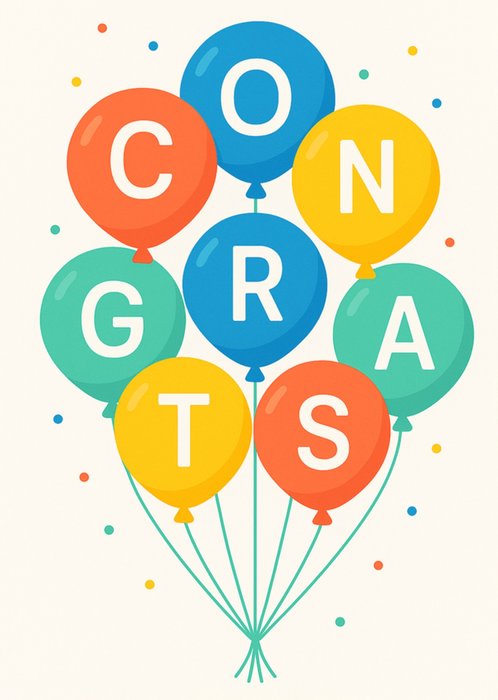 Featuring a cluster of bright balloons spelling out CONGRATS. Surrounded by scattered confetti dots on a cream background.