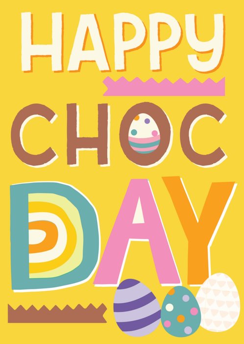 Front of card: Featuring large, bold lettering spelling "Happy Choc Day" with fun Easter egg illustrations and bright patterns on a bright yellow background.