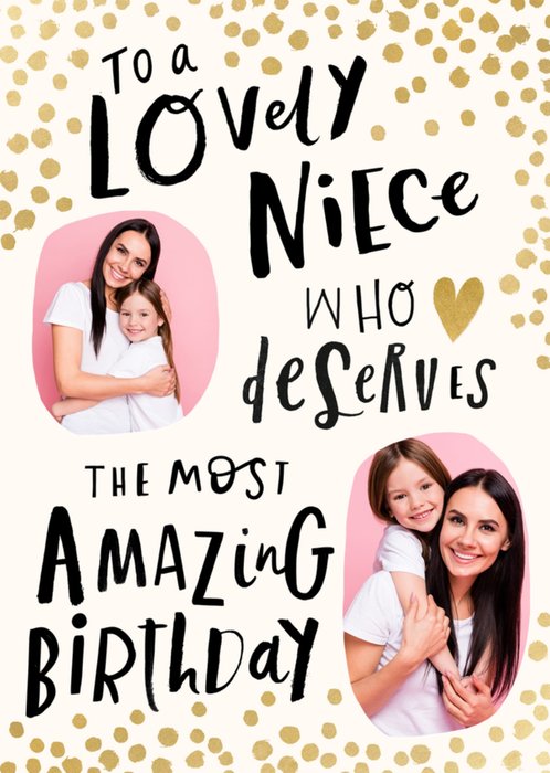 Featuring a collage of six personal photos with playful stars, hearts, and bows, and bold pink text for 'niece' on a cream and pastel coloured background.