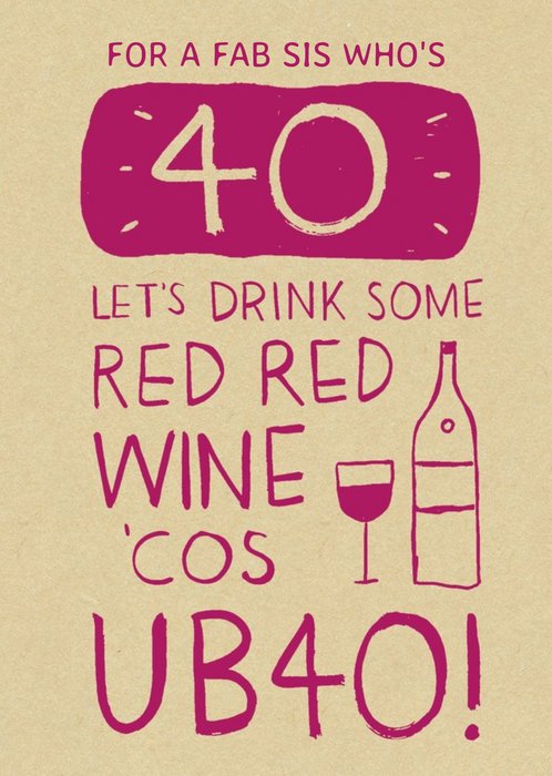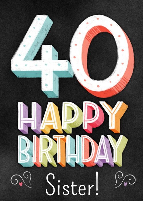 Front of Card: Colourful chalk typography on black background, with white illustrative border and small colourful hearts at the bottom. Text reads: 40 Happy Birthday Sister! With customisable text options.