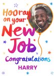 Front of card: New Job Photo Upload Congratulations Card Colourful typography surrounded by stars with a balloon shaped photo frame. Text reads: "Hooray on your new job congratulations Harry". 'Harry' can be personalised!
