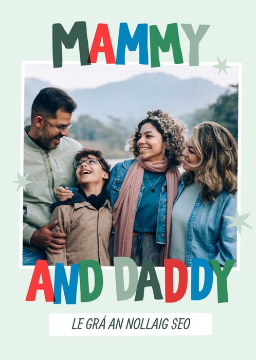 Front of card: Mammy And Daddy Photo Upload Christmas Card Colourful typography with a photo frame. Text reads: "Mammy and Daddy le grá an nolaig seo". Translates 'with love this christmas'. 'Le grá an nolaig seo' can be personalised!