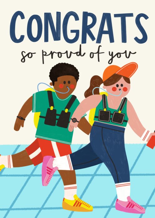 Featuring an illustration of two runners in sporty outfits with hydration packs and trainers on a white background.