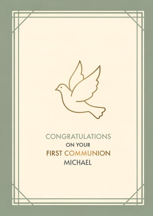 Illustration of a gold dove outline above a congratulations message with space for an editable name. The design has a green frame and a warm cream background.