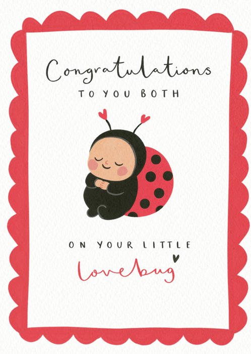 Featuring a sweet illustration of a sleeping baby dressed in a black and red ladybird costume with heart-tipped antennae, sitting with eyes closed and hands clasped, with a small heart motif beneath, all framed by a bold scalloped red border on a soft white background.