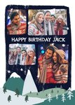 Front of card: A cool Happy Birthday card featuring a wintery mountain landscape scene including hills and trees all in a textured hand-printed effect. There are four photo upload areas.