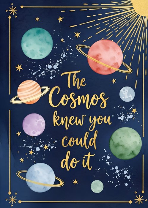 Featuring an illustrated space scene with colourful planets, stars and gold-effect rays with gold script text, all on a dark blue background.