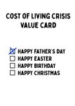 "Cost of living crisis value card" and "X happy Father's Day, happy Easter, happy birthday, happy Christmas".