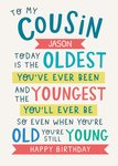 Front of card: Featuring vibrant typography on a cream background. Text reads: "To my cousin Jason today is the oldest you’ve been and the youngest you’ll ever be so even when you’re old you’re still happy birthday". 'Jason' can be personalised!