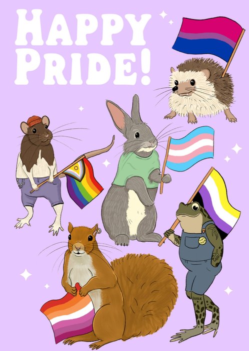 A whimsical and heartwarming Pride card featuring adorable illustrated animals, including a rabbit, frog, squirrel, mouse, and hedgehog, each holding different LGBTQ+ flags, including the Progress, Transgender, Bisexual, Non-binary, and Lesbian flags. Set against a soft lilac background with sparkles and bold white text.