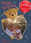 Front of card: Daddy's Photo Upload Birthday Card Cute bear holding a heart shaped photo frame and a balloon surrounded by stars. Text reads: "Happy birthday Daddy love you lots from Billy and Ted x". 'From Billy and Ted x' can be personalised!