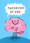 Featuring a cute, illustrated smiling pink brain character with a thought bubble on a blue, textured background.