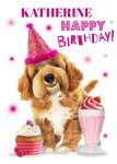 Cute Dog With Milkshake And Party Hat Personalised Card