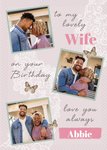 Front of Card: Three photo upload frames surrounded by illustrations of butterflies. The card reads: "To My Lovely Wife On Your Birthday Love You Always Abbie" "Wife" & "Abbie" are both editable.