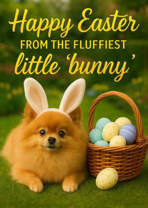 Featuring a fluffy dog wearing bunny ears, laying next to a wicker basket filled with small, pastel Easter eggs with bold yellow text at the top of the card.