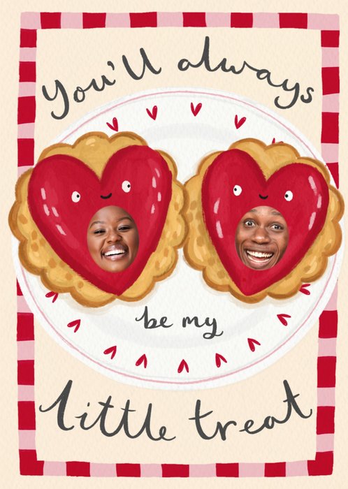Featuring two cute, heart-shaped jam biscuits with smiling faces on a plate. In the centre of the hearts are photo upload areas. With a red gingham border on a cream background.