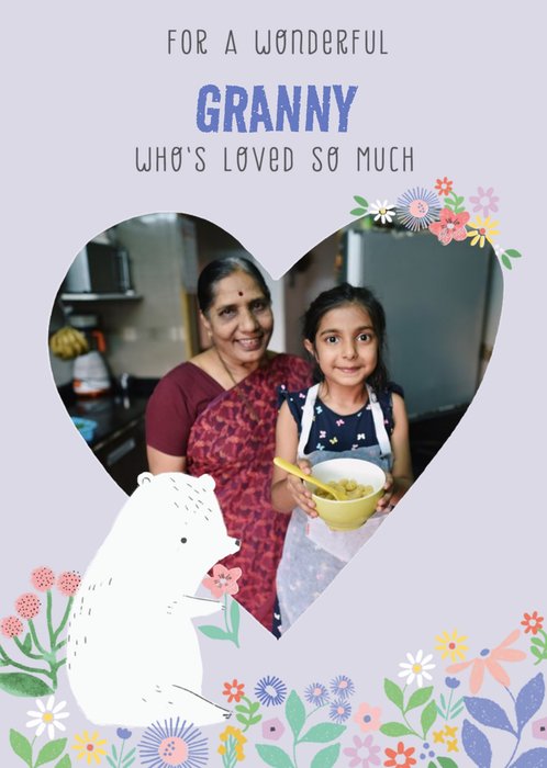 Front of card: Cute heart shaped photo upload space with an illustrated bear surrounded by flowers on a light purple background with editable text. Text reads: "For a wonderful Granny who's loved so much" With customisable Granny.