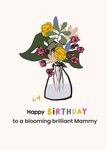 Front of card: Card features and Illustration of bouquet of flowers in a glass vase. Text Reads "Happy Birthday" editable text reads To a blooming brilliant Mammy