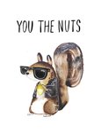Front of card: 'You the nuts!' Funny Pun Valentine's Day Card Cute illustration of a squirrel in cool shades and a leather jacket holding an acorn. Text reads: "Love you".