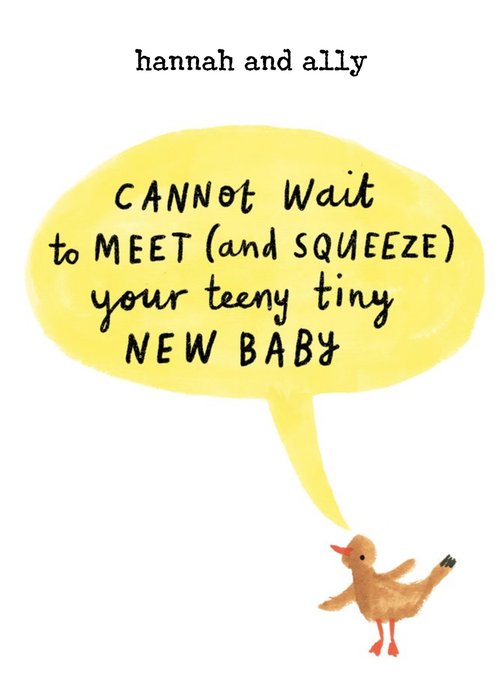 Front of card: Cute illustration of a little bird with a large yellow speech bubble above containing a cute message. Editable name spaces at the top of the card. Text reads:"Hannah and Ally. Cannot wait to meet (and squeeze) your teeny tiny NEW BABY”. With customisable name.