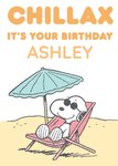 Cool Peanuts Snoopy relaxing on a Beach Illustration. Text reads: "Chillax Its Your Birthday Ashley"