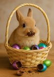 Featuring a cute baby rabbit with melted chocolate around it's mouth, sitting in a wicker basket surrounded by colourful foil wrapped chocolate eggs.