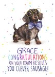 "GRACE CONGRATULATIONS ON YOUR EXAM RESULTS YOU CLEVER SAUSAGE!" with editable name text.
