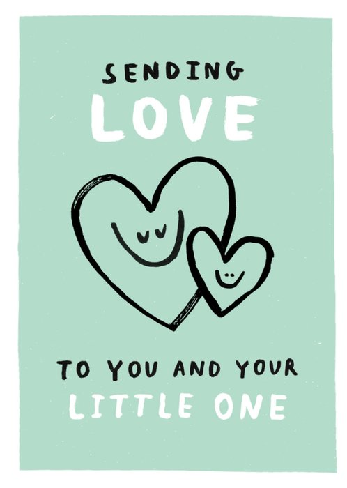 Featuring two hand drawn hearts with smiling faces, one large and one small, surrounded by text on a pale green background.