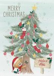 Front of card: Cute Illustration of Uddle peering around a large Christmas tree decorated with baubles, stars and Christmas stockings. Next to the tree is a wooden sign with the names "Helen & Mike". These names can be customised. Text at the top of the card reads "Merry Christmas".