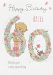 Large floral 60 in centre of card. Uddle peeking around number 6. Name can be personalised. Text reads: "Happy Birthday Hazel. Wishing You A Very Special Day"