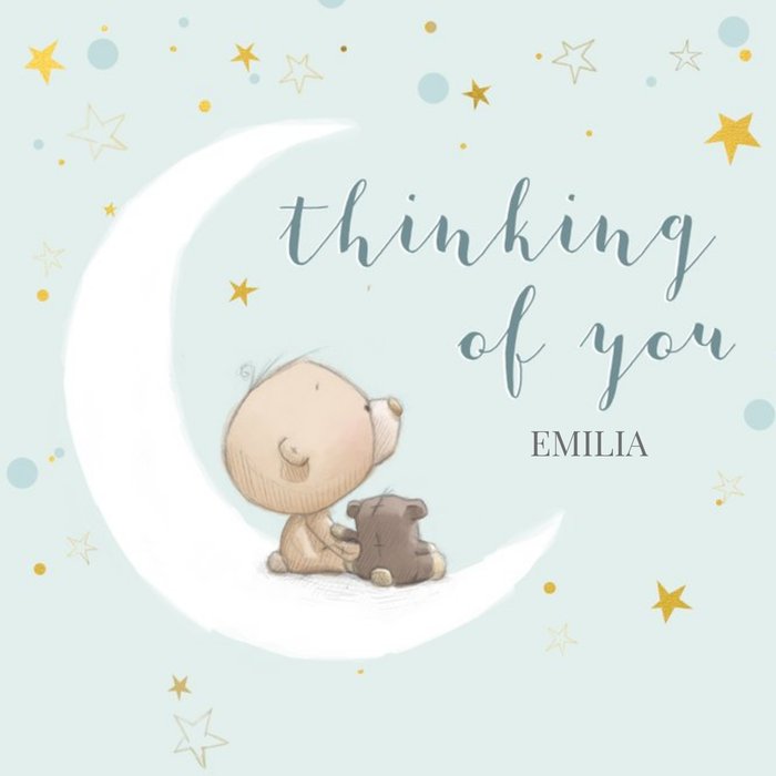 Uddle sat on a crescent moon looking at the stars. Personalised name