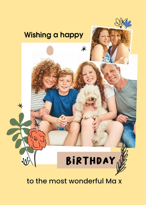 Front of card: Card features a large and smaller photo upload with cute floral illustrations on each of the photo upload corners. "Wishing a Happy Birthday" Editable text reads To the most wonderful Ma x