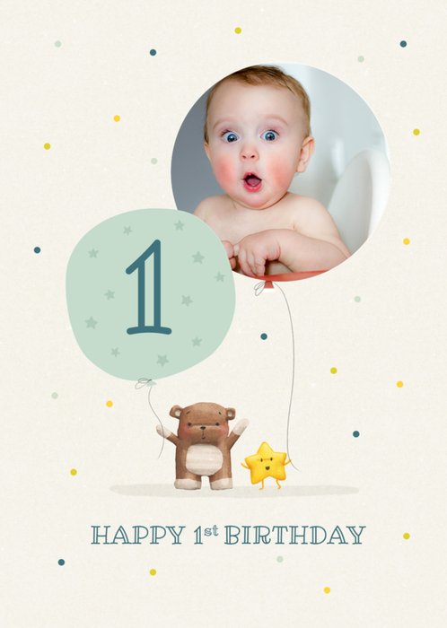Features cute kawaii style illustrations of woodland creatures and objects like pine cones, mushrooms and bees, with a photo upload area, text and a tree shaped like the number one.