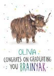 "OLIVIA CONGRATS ON GRADUATING YOU BRAINYAK" with editable name text.