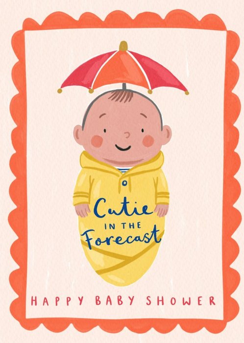 Featuring a smiling illustrated baby in a yellow raincoat-style onesie with hands showing, standing beneath a red and orange umbrella, framed by a bold scalloped orange border on a soft peach background with “Happy Baby Shower” along the bottom.