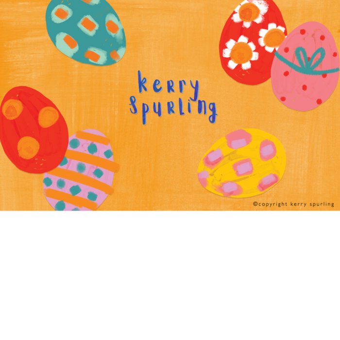 Featuring hand-painted colourful patterned Easter eggs surrounding chunky yellow lettering on a white background.
