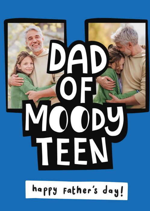 Front of card: This bold and humorous Father's Day card features two photo slots and playful, oversized lettering on a bright blue background. The word 'moody' has the side eye emoji as it's two o's. It's the perfect way to acknowledge Dad’s hero status in the face of teenage moods!