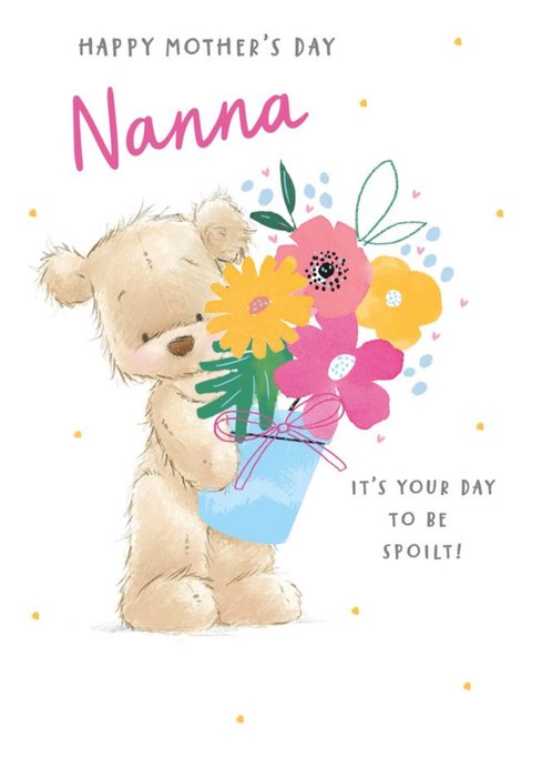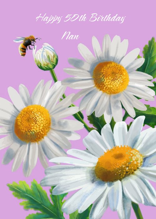 Front of card: Floral art design with illustrated daisies and bumble bee milestone Nan birthday card.Text reads: "Happy 50th Birthday Lovely Nan". Happy 50th Birthday and Nan can both be personalised.