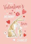 Front of card: Danilo Guess How Much I Love You Mummy Valentine's Day Card Features cute illustration of a baby hare reaching up on it's back legs to a Mummy hare. Pink background surrounded by love hearts and flowers. Text reads: "Happy Valentine's Day To My Mummy. Love From Charlie". Mummy and Charlie can be personalised Back of card: Guess How Much I Love You Logo
