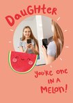 This greeting card design features the word “Daughter” in playful red text at the top, with a circular photo upload area located in the centre, surrounded by hand-drawn decorative lines. A cute illustrated watermelon slice with a smiling face sits at the bottom left of the photo, accompanied by the handwritten phrase “You’re one in a melon!” in red text on the bottom right. The background is a peachy pink colour.