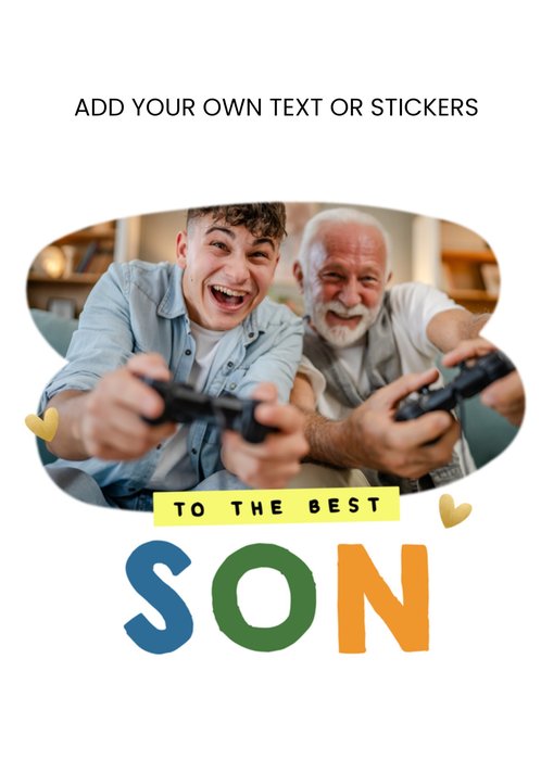 A modern, minimalist design featuring a central large photo upload area, with fixed text below, on a white backround. Fixed text reads: "To the best Son." Above the photo upload there is fully editable text, allowing you to create a truly personalised card and add stickers.