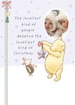 This ‘Winnie the Pooh’ Christmas card design features Pooh Bear and Piglet decorating with a festive star ornament, accompanied by a heartfelt message on a soft lavender background with delicate snowflakes and silver dots.