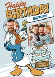 Front of card: Featuring an illustration of Donald Duck and birthday cake with two photo frames. Text reads: "Happy birthday Morgan!". 'Morgan!' can be personalised!