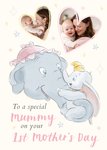 Featuring a soft watercolour illustration of a Mummy elephant cuddling a baby Dumbo with her trunk. With two heart-shaped photo frames and little star doodles on a cream background.