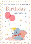 Featuring an illustration of Dumbo with two balloons attached to his trunk set on a white background with rainbows, swirls, stars & moon illustrations and a patterned border around the edge, with typography at the top of the card, all in soft, pastel colours.