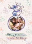 This ‘Lilo and Stitch’ birthday card features a heartwarming illustration of Stitch and Angel hugging at the top, with a circular photo upload area placed centrally below the characters, framed by soft pastel tropical leaves, flowers, and star patterns, alongside the message “Here for cuddles on your Birthday” in a handwritten-style script.