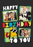 Imagine receiving a colourful Birthday card with a dark, dotted background. In the centre, there are four lively frames containing photo upload areas in three of them. Around the frames, are delightful illustrations of Mickey Mouse and Pluto wearing sunglasses, looking cool! There is fun and bold, multi-coloured text throughout the design.