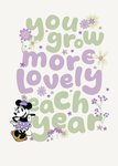 The greeting card features soft, playful text that reads, “You grow more lovely each year” in pastel green and purple, surrounded by delicate flowers. Minnie Mouse, dressed in a cute lavender outfit with a flower on her hat, stands smiling on the left. The overall design feels light, cheerful, and sweet, with a floral theme.