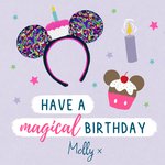 Front of card: Featuring hand drawn Disney Minnie Ears Headband and Mickey Ears cupcake, with text below. Text reads: "Have a magical birthday Molly x."