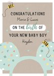 "Congratulations Maria & Lucas on the birth of your new baby boy Hayden". 'Maria & Lucas' and 'Hayden' can be personalised!